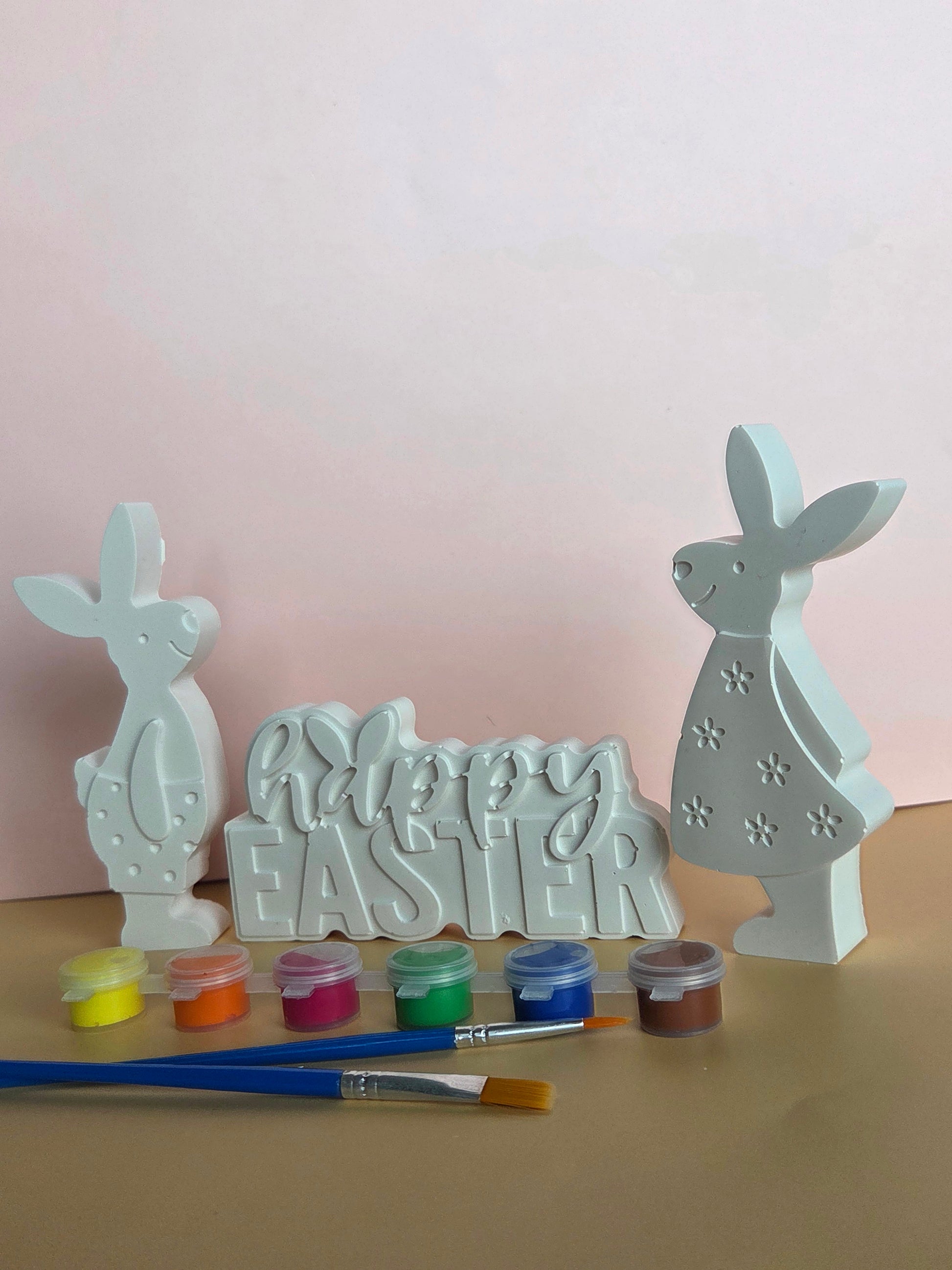Our Easter Paint Kit includes 3 self-standing decorative moulds: two adorable bunnies and a “Happy Easter” figurine, ready to be brought to life with your own personal touch. With 6 vibrant paint colours and 2 large brushes, everything you need is inside the box.